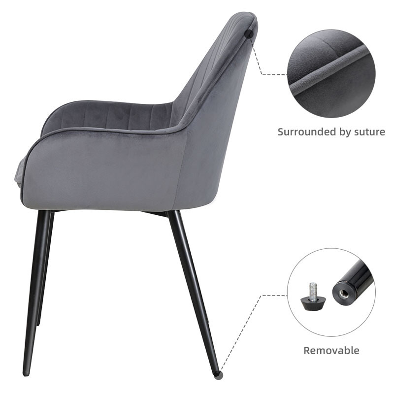 Nordic Style Grey Velvet Dining Chairs With Armrest Metal Leg