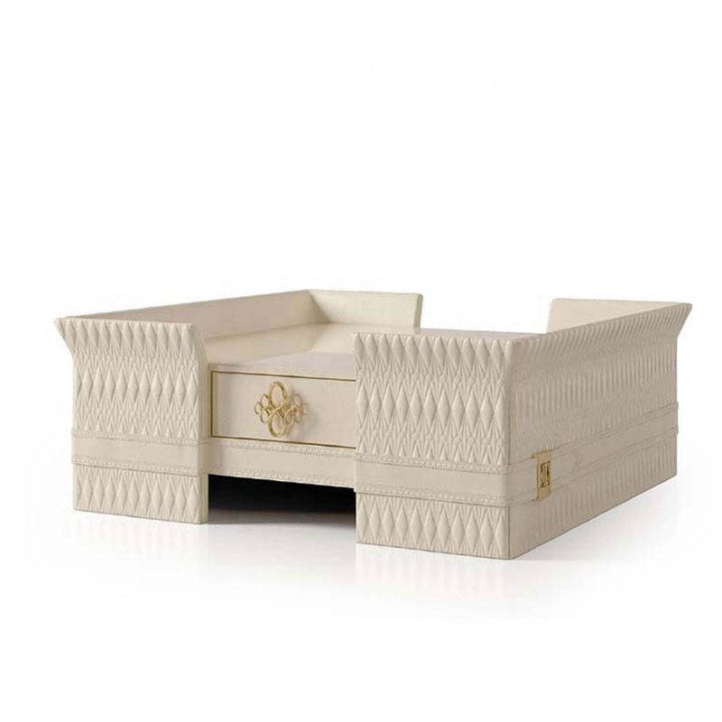 The coffee table of the collection designed to be functional and elegant at the same time, has a wooden structure with a glossy lacquered finish and embroidered leather upholstery. The cabinet consists of a glass display cabinet, two wooden doors and an open compartment with leather and metal handles. It becomes a perfect element to furnish living and dining areas.